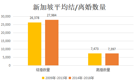 从长远看,过去的5年(2014年-2018年)中,新加坡平均每年结婚数量为27984对,比2009-2013年的26378对增加了5.74%。同时,平均每年的离婚率也增加了。从2009到2013年的7397起,增加到了2014年到2018年的7473起。不过,2018年新加坡人的平均婚姻维持长度比10年前稍微长了0.3年。