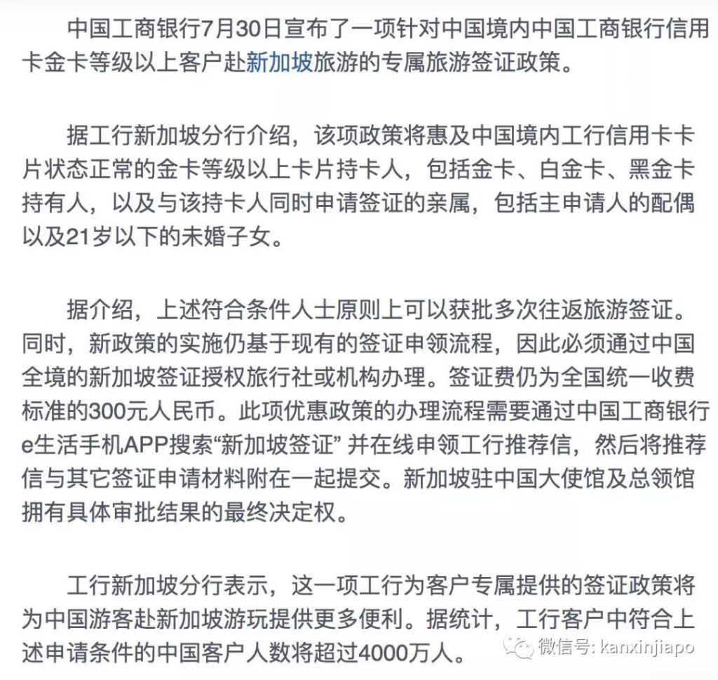 无独有偶,今天新华社也公布了一个有关新加坡签证的利好消息,中国工商银行信用卡持卡人,办理新加坡签证更加快捷、便利了。