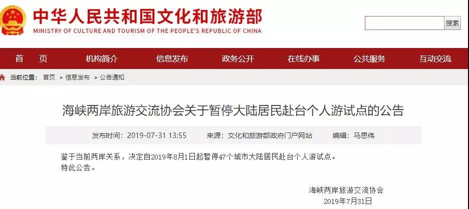 今天,中国宣布,鉴于当前两岸关系,决定自2019年8月1日起,暂停47个大陆城市居民赴台个人旅试点!