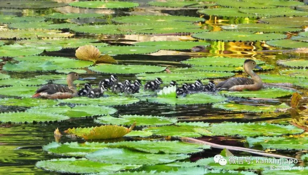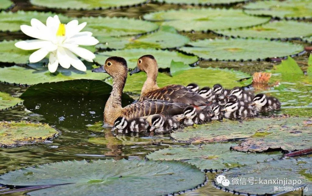 众所周知,新加坡滨海湾花园有不少可爱的“居民”,水獭家族算是大家最熟悉的。今年6月底,树鸭家族风光亮相滨海湾花园。一对树鸭父母带着11个树鸭宝宝,在睡莲间来回穿梭。