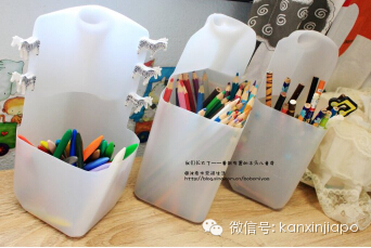 最后分享一个牛奶桶做笔筒的方法,如图所示,就算孩子们把笔都倒出来了,我也能几下就收拾好。