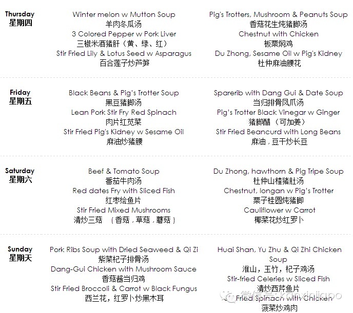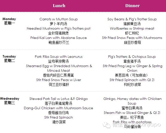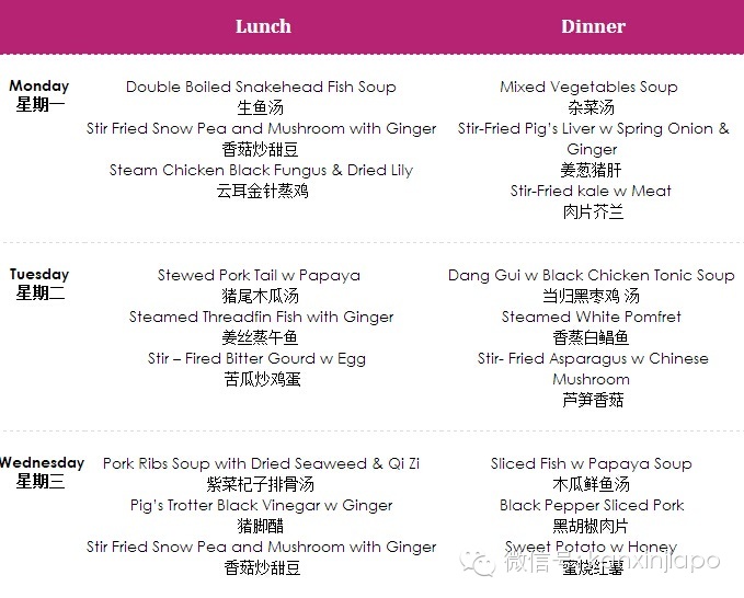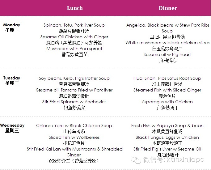 新加坡眼按:之前发送的图文《新加坡月子餐,28天详细菜谱!》被广泛传播,应外国友人要求,特此附上英文的简短介绍,供参考。如需详细的英文菜谱,或需要预定,可写邮件至[email protected],或加微信:xinjiapoyan18 获取详情。
