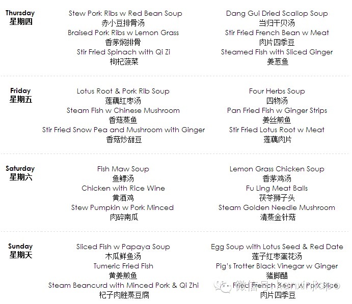 下面与您分享东南亚比较主流的月子餐菜谱供参考。这份菜谱在中国传统饮食营养搭配的基础上,根据东南亚本地气候环境进行了调整。