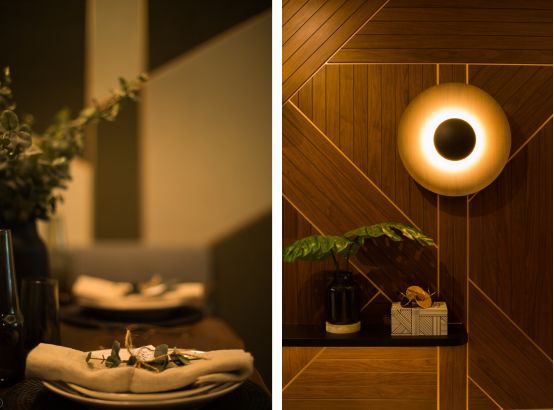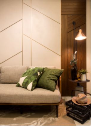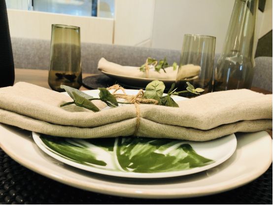 2.发现一个细节的亮点,成套绿叶沙发抱枕和餐盘,超有设计感!细问才知道,是公司一位美女周末逛街时看到的,觉得配样板间超搭,就买回来摆在这里了。