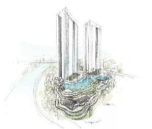 因为庭·维苑紧挨蓄水池,从远处看,高楼就像建在水田之上,周边的公共设施也像农田附近的村社,把现代城市和田园的感觉完美融合。而项目内设计独特造型的泳池,并引入大量水文景观——“所谓伊人,宛在水中央”。