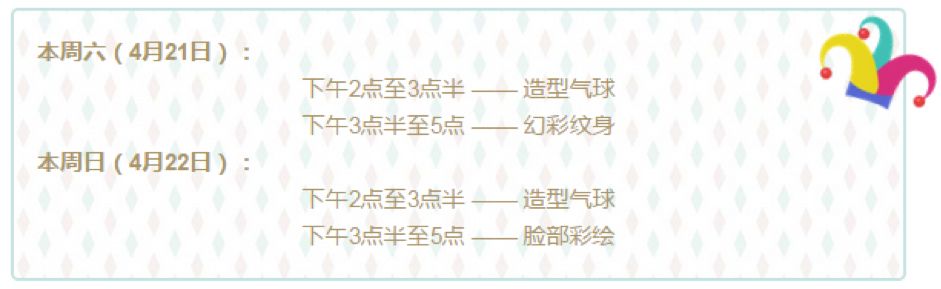 时间:4月21日(周六)开始,每天早上10点到下午6点