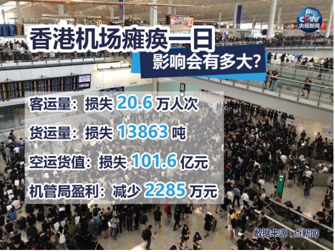 (香港今昔对比,来自《人民日报》)香港财政司司长陈茂波在8月21日也表示,香港经济正面临内忧外患,经济增长自2018年首季开始放缓。陈茂波介绍,2019年7月及8月旅客量大幅下跌。从8月1日至16日,旅客量首星期跌33%,第2周跌超过30%,最近一周跌近40%,预计第3季度情况更差。光是香港机场,就因为两天的示威集会,导致客运量损失至少20万人次!