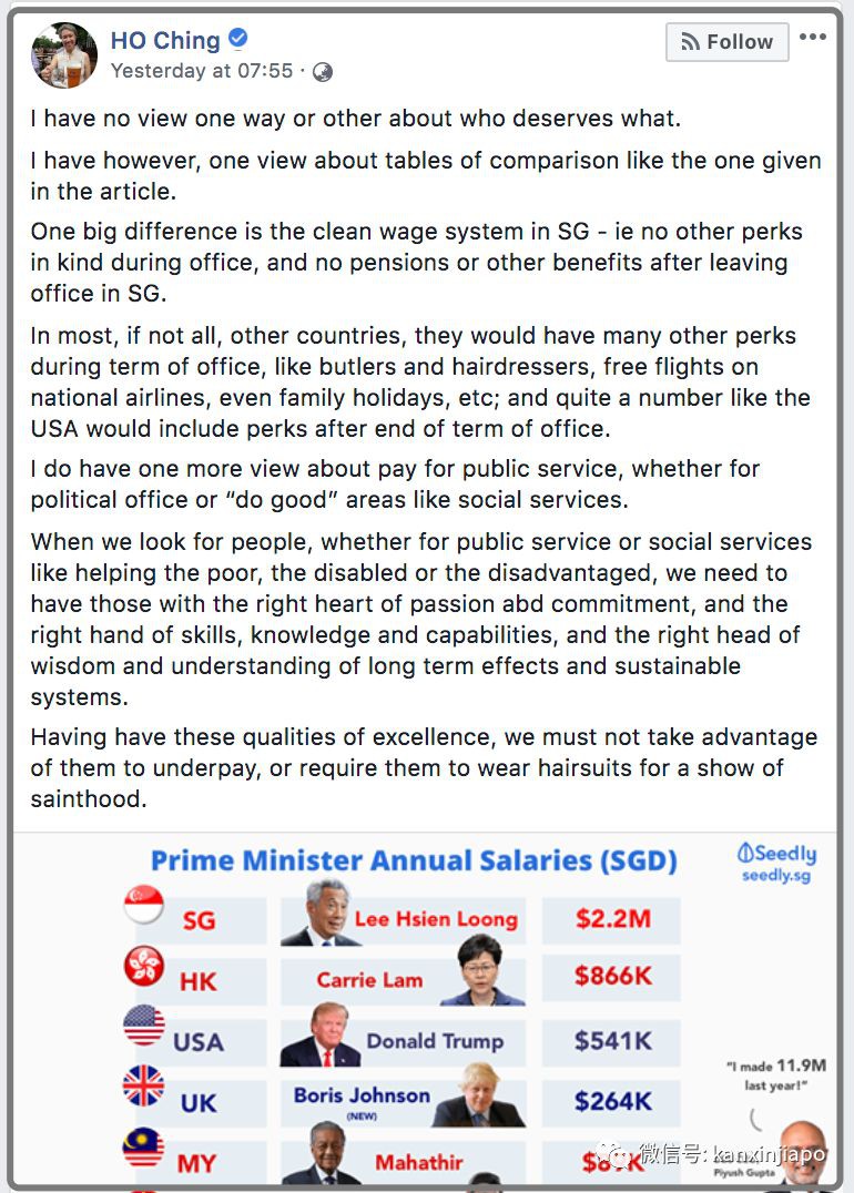 图源:Seedly.sg对比这些人的年薪,李显龙确实是“一枝独秀”,薪水比他们加起来都多!不过,除了隐隐diss李显龙的年薪外,文章中也解释了新加坡用薪水来吸引一流人才担任政治职务的做法。新加坡领导人的薪水一般都与私人机构所支付的市场薪金挂钩。