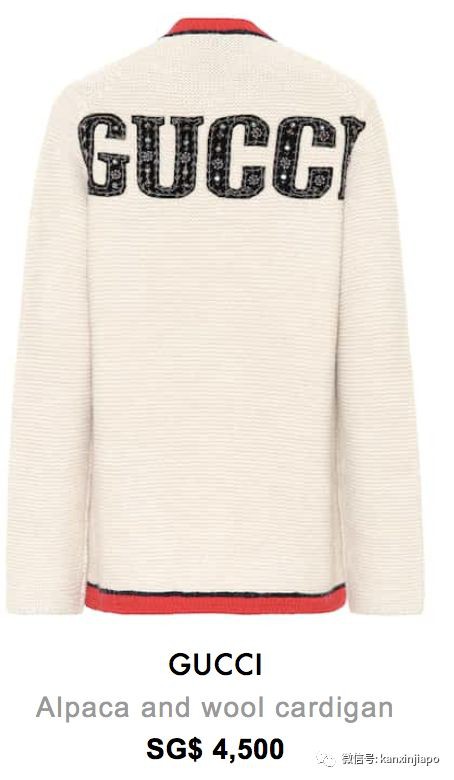 这名女子去年12月14日来新加坡旅行,入住在圣淘沙的一家酒店。(嗯,感觉貌似挺有钱?)12月16日晚上9点左右,她在滨海湾金沙的GUCCI店偷了件米色羊毛衣,价值4500新币。衣服上镶有水晶,大概长这个样子: