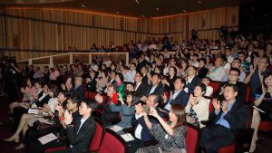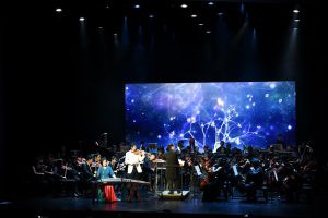 毋庸置疑,由原创作曲家何占豪指挥的《梁祝》是全场的最大亮点了!当《梁祝》享誉世界60载的珍贵时刻,86岁的艺术家何占豪依然不断创新,亲自编曲了古筝和小提琴联手独奏,交响乐团协奏的《梁祝》。这个版本由他本人亲自指挥在中国以外的国家舞台,还是首演的第一场。担当本场小题琴独奏的是– 中国人民大学管弦乐团团长、中国国家一级演员、中国国家交响乐团原《梁祝》首席的程亚威,古筝独奏的是– 香港中乐团筝首席罗晶。在小提琴演奏家程亚威与古筝演奏家罗晶惟妙惟肖;牵动人心的以两个东西方乐器协作独奏表演时;在以经典的旋律诉说东方的罗密欧与朱丽叶的故事时;在新加坡与中国表演者携手全情演出时;在多媒体舞台呈现情境效果拓展艺术展现感受和空间时;在86岁的艺术家何占豪将沉淀了60载的旋律以指挥棒带动交响乐团深情抒发时;在大会主宾-吴作栋资政夫人陈子玲女士、特别嘉宾– 中国驻新加坡大使洪小勇阁下与全场观众一同的见证中,流淌着的经典《梁祝》,沁入新加坡维多利亚剧场每位台上台下,台前幕后所有人的心扉,在8月23日晚上,无论是谁?从哪儿来?都一同在音乐中呼吸感动,一同见证感受着,这个镌刻在人类文化史册的伟大作品,其弥足珍贵的时刻!