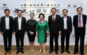 “梁祝60周年音乐会” 中场休息时,左5主宾吴作栋资政夫人陈子玲女士、左4特别嘉宾中国驻新加坡大使洪小勇阁下、右3交通银行新加坡分行行长曲忠庆与何占豪先生及部分参演者合影