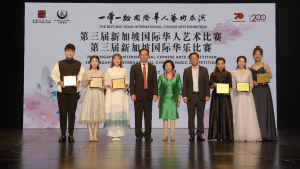 “第三届新加坡国际华人艺术比赛和第三届新加坡国际华乐比赛”获奖选手与颁奖嘉宾-中国驻新加坡文化参赞阙小华及评审团合影