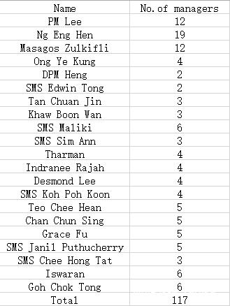 “摘得桂冠”的,是新加坡国防部长黄永宏医生。他名下有19名管理人员。