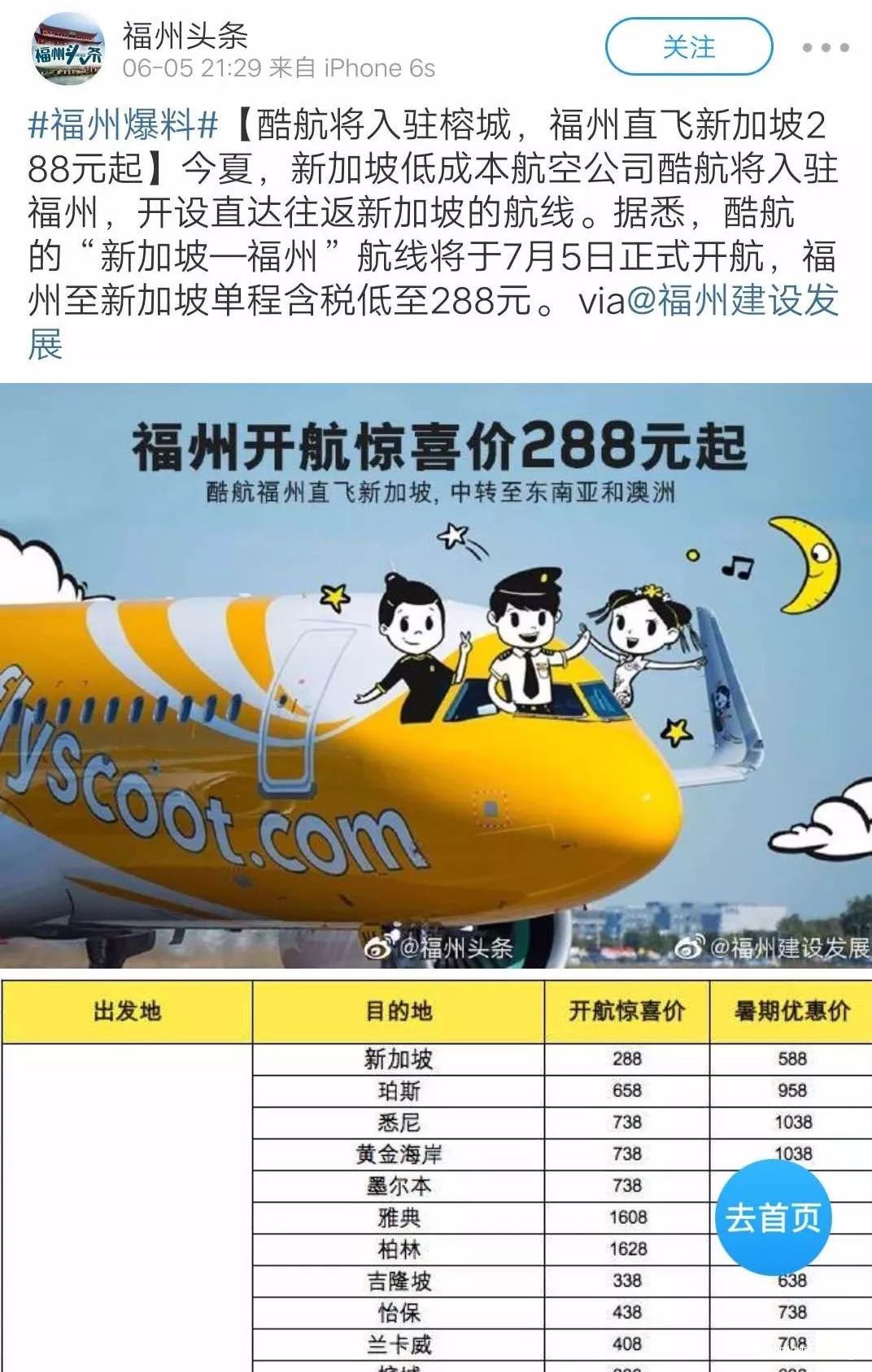 话说,很多人心心念念的酷航直飞福州的航班,据最新爆料,将在今年7月5日开航…….