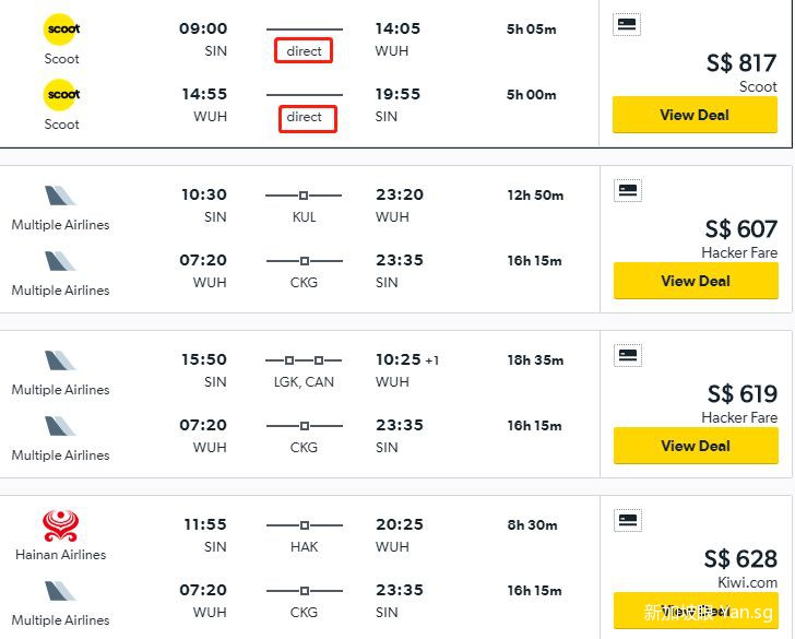在线旅游网站上,这是新加坡现今直飞武汉的唯一航班。其他航班要不在吉隆坡机场中转,要不在广州、海口等机场中转。