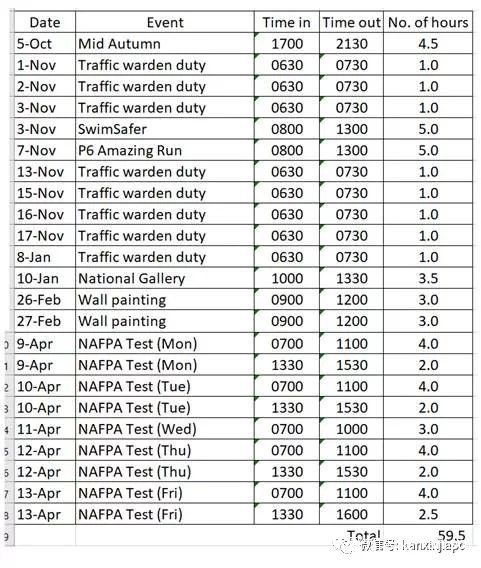 就这样,到了2018年4月13日,59.5小时入袋,比要求的40小时多了50%。(新加坡眼注:做义工的小时需要达标,但也不是越多越好。学校其实不鼓励家长一味攀比时长)