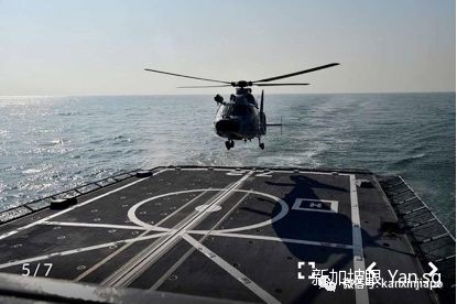 在当时的演习中,人民解放军海军哈尔滨舰舰载直升机在忠诚号上降落。