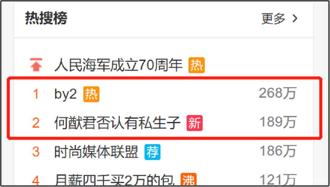 今天,”by2“以及”何猷君否认有私生子“被刷上微博热搜榜前两名:
