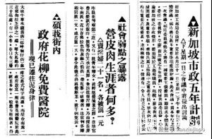 “本坡要闻”的头版则有以下新闻:新加坡市政五年计划、营皮肉生涯者何(其)多、政府花柳(病)免费医院现已迁往泥身律(编按:早年新加坡的路名多作“律”,为闽南音)。