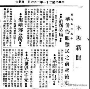 而“本坡新闻”的头条是日军空袭上海之后,哀鸿遍野,新加坡华侨筹款赈济之事: