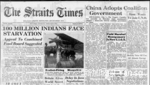 1946年2月1日,除夕;2月2日,大年初一,新加坡英文报章《海峡时报》头版头条,报道印度百万人陷入饥荒;头版次条,报道国共两党在重庆举行政治协商会议,通过了政府改组案、和平建国纲领案、军事问题案、国民大会案、宪法草案等案。