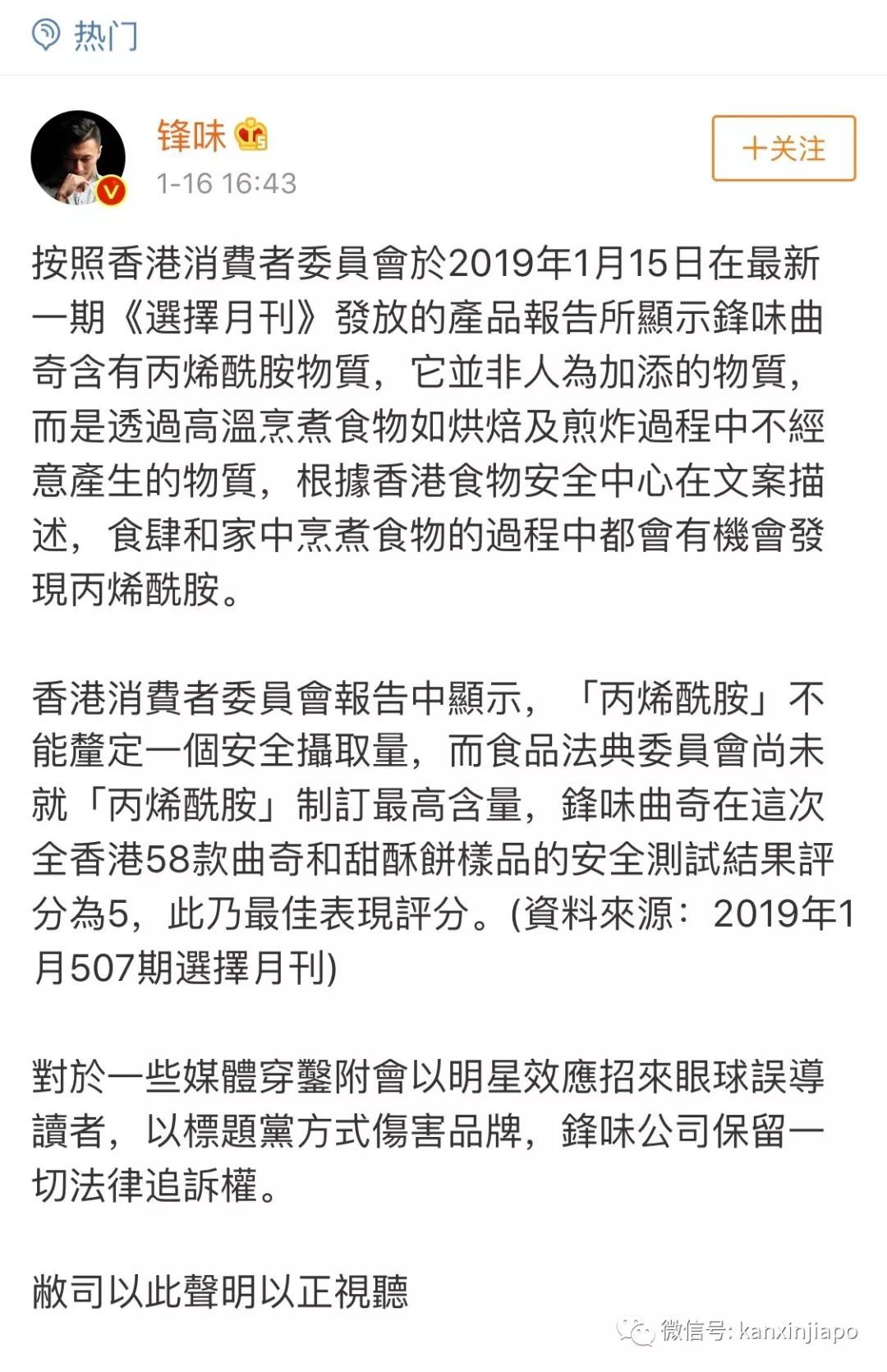 今天16:43,谢霆锋在微博上做出了回应:丙烯酰胺是高温烘焙过程中产生的,我的饼干没问题!