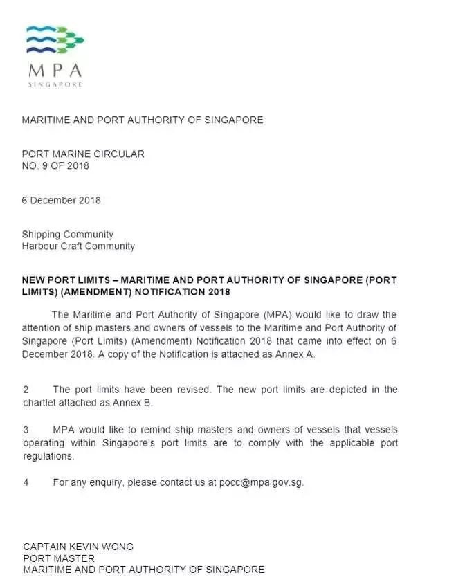 新加坡政府今天发布《2018年新加坡海事及港务管理局(MPA)(港口海域界限)(修正)通告》