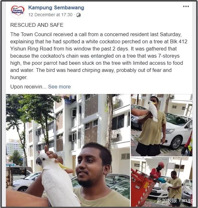 贴文上说,他们收到一个居民的热心电话,说自己已经连续两天从自家窗户看到外面树上有一只受困的白色鹦鹉……..