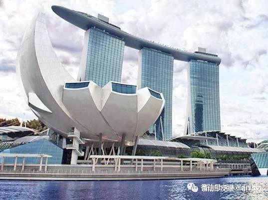 旁边白色像莲花的建筑是艺术馆。金沙每晚8点多有灯光秀,从滨海艺术中心连接鱼尾狮的桥上可以拍出超美的照片哦~