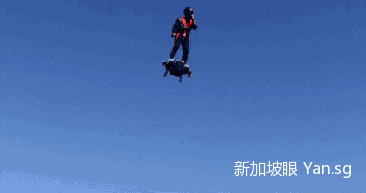 但这次在滨海湾亮相的可不是水上飞行器。它把飞行器上的大水管换成了喷气式动力,用涡轮增压引擎加两侧控制平衡的辅助引擎,让人腾空飞起!除了可以飞行之外,还能在空中静止不动!