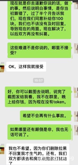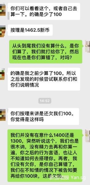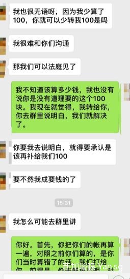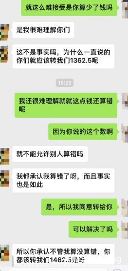 过了大半个月,她突然发信息给我说当初她们算错了,少了100块,要我们打钱。