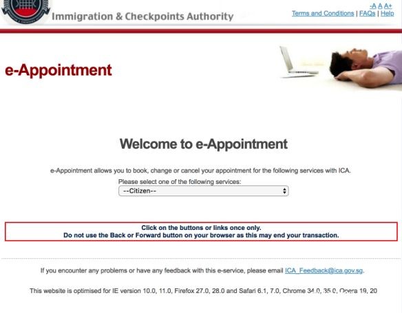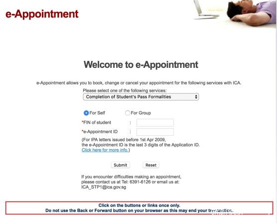 STP的办理,需要提前在线预约挂号。由于开学季,办理学生签的人特别多,所以建议大家在入境新加坡之前拿到IPA letter后便可以开始预约STP办理啦。大家可以前往新加坡ICA的官网上办理预约,在进入预约系统网页的服务项里选择”Completion of Student’s Pass Formalities ”。