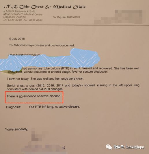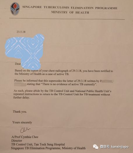 然而,5月的时候,她收到新加坡卫生部的信件,根据体检报告,请患有肺结核的网友到设在陈笃生医院内的结核病控制机构(TBCU)做后续治疗。