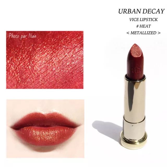 HEAT可是被很多博主力推的色号哦!膏体带闪,像眼影一样的金属闪,超大颗的闪片,显白无敌,看上去重口,平时日常妆一点都不突兀。这只口红一年四季都可以涂,里面的金闪很夏天,元气少女必备;冬天用又很温暖,和大衣、毛衣很配。