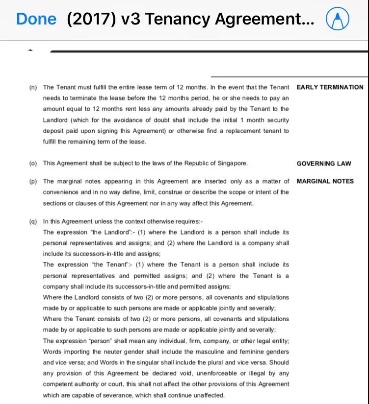 我租房子,当时签了两年合同。记得一条就是关于提前退租会不会赔钱,那条写着要是因为工作调动提前离开新加坡,就无需赔偿。