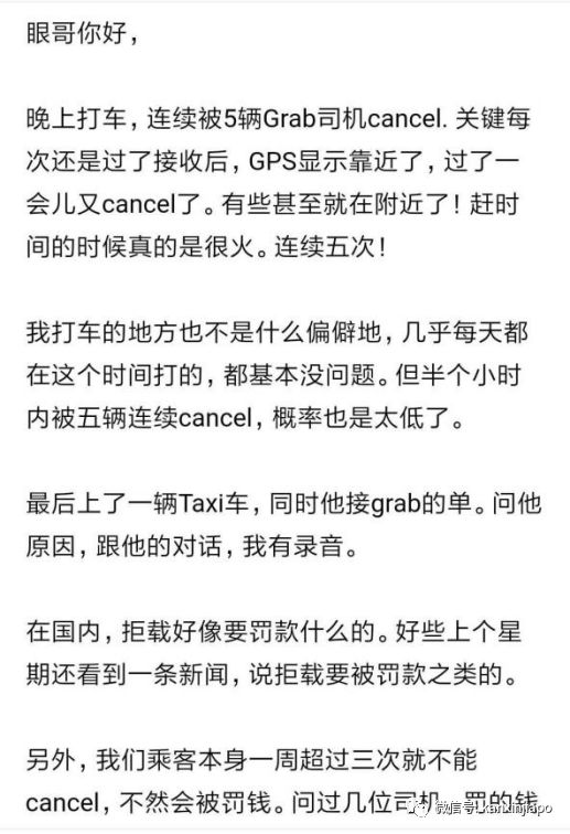 一位网友跟我们“抱怨”,自己叫了5次Grab,都被拒载了,关键是每次都还是接了单之后,最后他从一位Taxi司机口中得到了答案……我们原函照登。