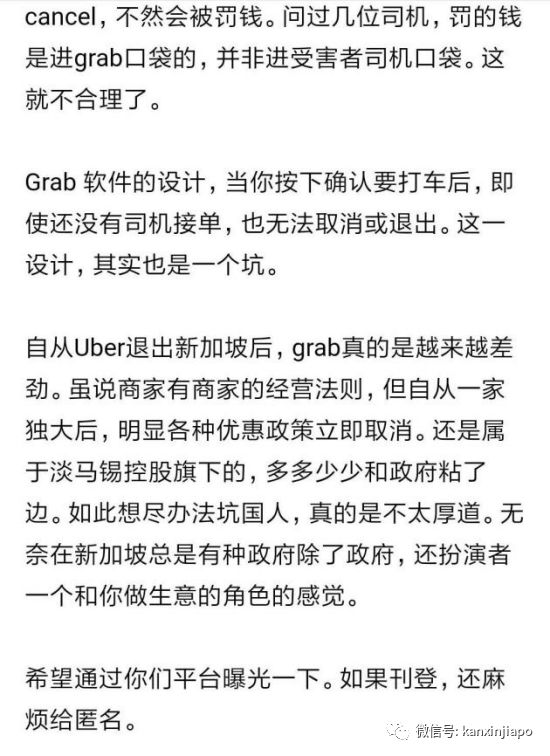 原来,司机们在接单后,便能得知乘客的目的地以及要交付的车费。低于$10车费,一般都会拒载。即使知道一周不能cancel超过三次,司机仍然选择这样做。但此时,罚款也并非补偿给乘客,而是被grab收取了。投稿人认为grab软件的设置也存在缺陷,当你按下确认要打车后,即使还没有司机接单,也无法取消或退出。