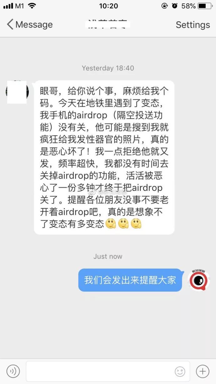 有网友因为没有关掉手机隔空投送功能(airdrop),结果在地铁上收到陌生人发来不雅照骚扰……