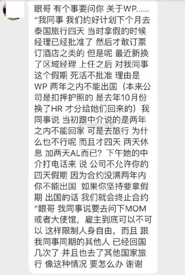新加坡眼收到网友求助,反映自己拿WP准证,想要去新加坡周边旅游,但公司不允许,如果坚持拿假,还要终止合同。