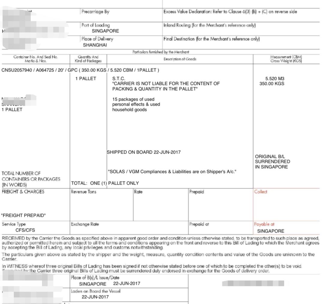 后来我在网上搜到了一家上海的国际物流公司,打了电话给他们,和他们的业务经理联系了相关事宜,委托他们将家具和生活用品从新加坡运到上海,再送至国内家里。他们根据我拍的家具照片进行了所有费用的估价。当时我觉得货值比起这些搬家成本来说是可以接受的,便决定用他们公司提供的服务。