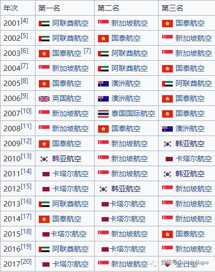 新加坡航空(Singapore Airlines)新西兰航空(Air New Zealand)阿联酋航空(Emirates)日本航空(Japan Airlines)长荣航空(EVA Air)西南航空(Southwest Airlines)捷特二航空(Jet2.com)卡塔尔航空(Qatar Airways)巴西阿苏尔航空(Azul Brazilian Airlines)大韩航空(Korean Air)而之前,在其他榜单上,新加坡航空近几年一直被卡塔尔、和阿联酋等中东土豪们压着……
