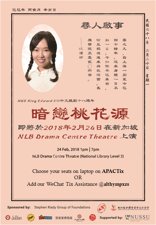 春节假期将至,想必大家心中浪里个浪的念头,已经蠢蠢欲动。来自新加坡国立大学King Edward VII Hall中文戏剧社的同学们,为大家提供了一个低调奢华接地气,高端大气上档次的春节打开方式——农历大年初九(2月24日星期六,NUS Recess Week 第一天),在国家图书馆戏剧中心的舞台上,欣赏中文戏剧名作《暗恋桃花源》。