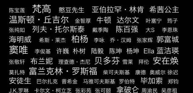 比如:丘吉尔、林肯、牛顿、达尔文、托尔斯泰 、海明威、柏杨、三毛、崔永元、杨坤、白岩松、憨豆先生、戴安娜、爱因斯坦等等。