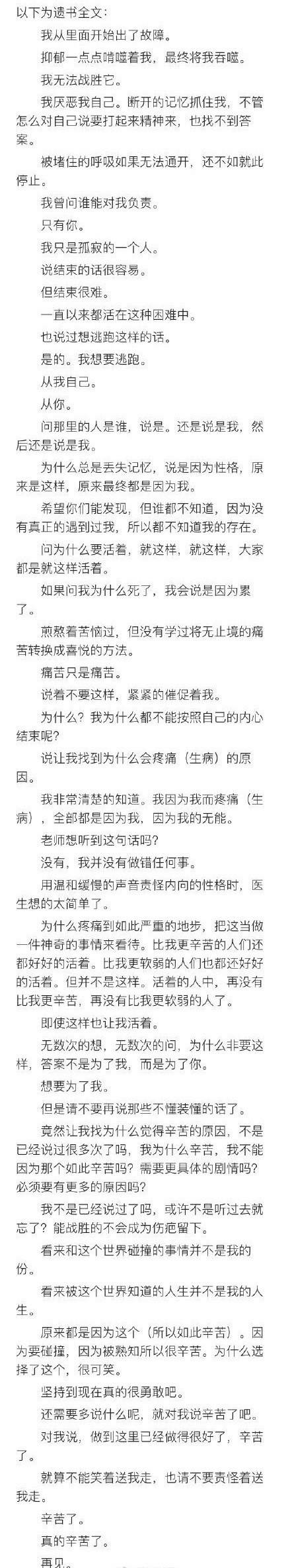 这是金钟铉的遗书,一颗深陷痛苦不能自拔的灵魂跃然纸上。他生前希望如果自己有一天离开这世界后,可以把他的以下文字公布出来。