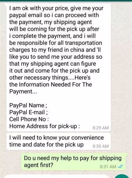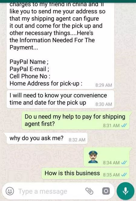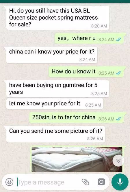 最近搬家要卖一些家具和冰箱,在gumtree发布了广告,很快就引来了网络诈骗通过电邮,whatsapp搭讪,手法完全一样,截屏whatsapp对话,提醒大家注意,他先说对商品感兴趣,价格接受,但人在海外,需要第三方负责运输,最后就是因为转账问题需要我垫付运费,一步步引人入套,好在警惕性高!