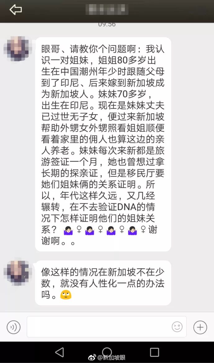 编者按一对80多岁的姐妹,姐姐是新加坡人,妹妹持印尼护照。妹妹想申请新加坡长期探亲证来帮忙照看家人。新加坡移民厅要姐妹俩的关系证明,年代久远,难以找到当年的出生证,有什么办法可以不用去验DNA而证明两人的关系呢?对于新加坡这样的多元化国家,类似事情并不少见,如果是你,会怎么办?