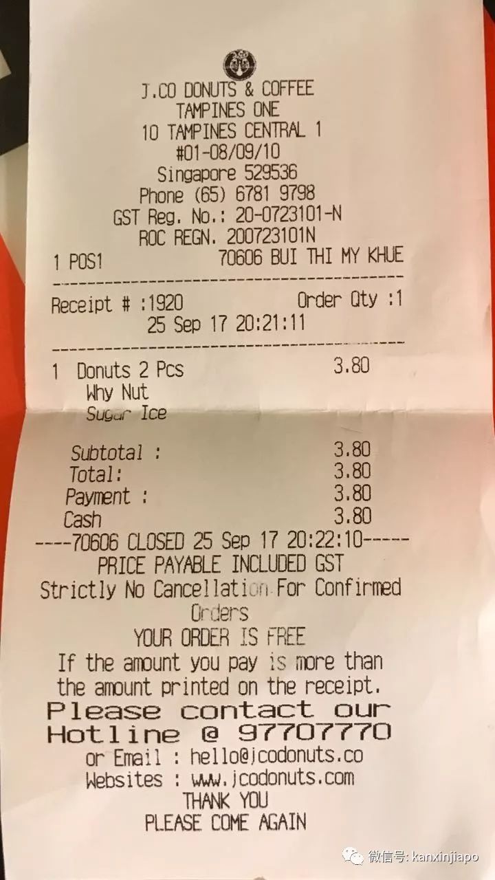 眼哥你好!跟你咨询个事,我9月25号在Tampines 1 买了两个J.co donut 的甜甜圈。