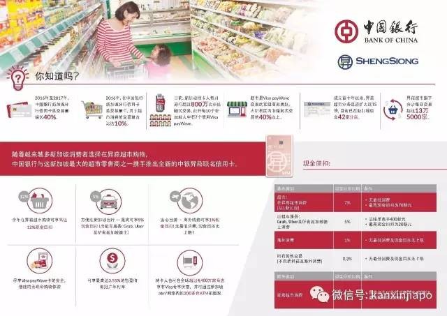 中行最新推出的中银昇菘卡,只要刷卡,没有任何最低限制,就可以在昇菘获得7%的返现,每个月最高70新币;如果家庭成员比较多,每个月在昇菘超市以外的花费高于400新币,在昇菘超市里的花费还能额外获得5%返现!