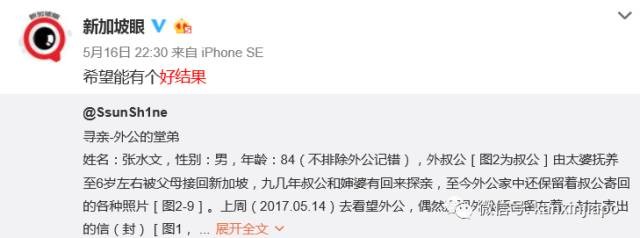 外公已88岁高龄,时刻深切的思念着远在海外的堂弟,希望在有生之年能在与失去联系多年的叔公(望还健在)见面哪怕通个电话!我也希望能在外公有生之年帮他完成这个心愿。如有线索请您联系我。不胜感激!@新加坡眼