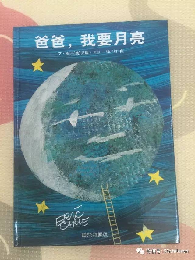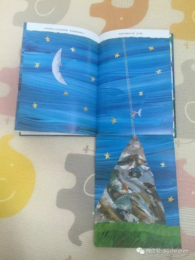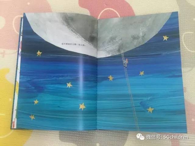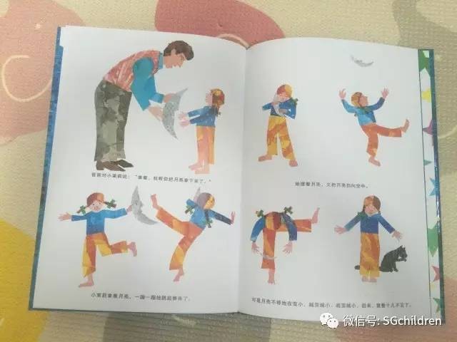 第三本书同样是艾瑞·卡尔绘著的拼贴画风格的《爸爸,我要月亮》。书中的主人公是一个小姑娘,女儿是爸爸的小情人,对于女儿撒娇式的请求,爸爸恨不得摘星星、摘月亮都要满足,本书恰如其分地表达出爸爸对女儿的这种疼爱。深蓝色的天空,加上画笔刷过的机理,粗狂却显得很有质感,挂在天上的月亮散发着迷之微笑。为了满足女儿的要求,爸爸搬来了很长很长的梯子、爬上了很高很高的山,本书的设计贴合情节,巧妙地增加了插页,将爸爸的长梯子、爬上高高的山去摘月亮、以及大大的月亮都具象地展现在眼前,增加了孩子阅读时的惊喜感,天马星空的故事也拓展了孩子的想象力。不仅如此,书中还渗透着月亮随着时间而变化的科学知识,爸爸们不妨也找个时间,同孩子一起记录一下月亮的变化吧。
